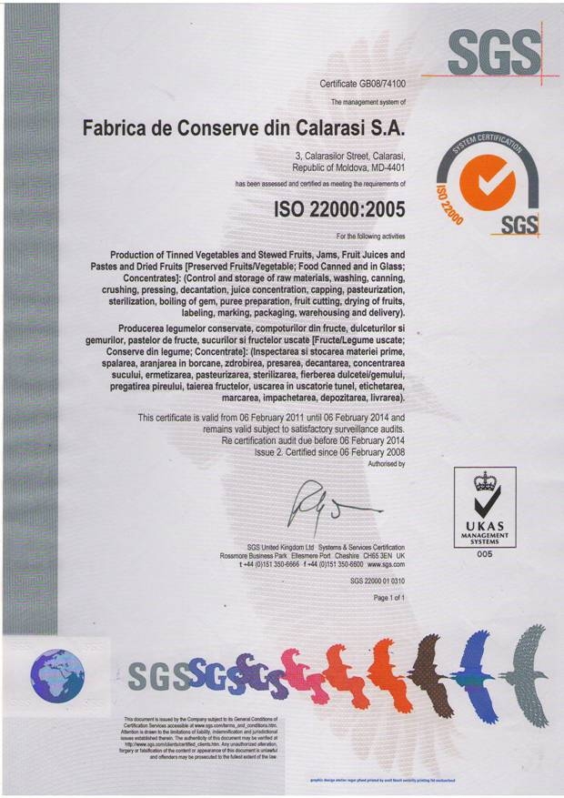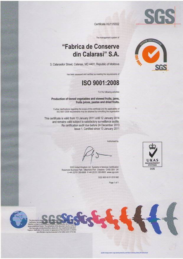 On 26th of December 2013, Calarasi Cannery was visited by SGS Moldova inspectors to audit whether the company will renew its ISO certification. No major non-conformities were found. Thus we are waiting for the new certificates to be issued that will prove that Calarasi Cannery complies with the ISO 9001 and ISO 22000 standards.This will be the second ISO 9001 – the first certificate was received in February 2011 and the third ISO 22000 – the first certificate was obtained in January 2008.